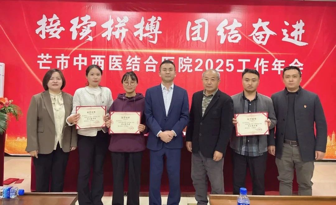 院长李宏作工作报告 党支部副书记黄辉宣读了《芒市中西医结合医院关于表彰2024年度优秀员工的决定》,对勤奋敬业奖(4名)、学习进步奖(3名)、长期服务奖(4名)给予表彰,与会领导为受表彰的优秀员工颁发荣誉证书,并对他们致以热烈的祝贺。